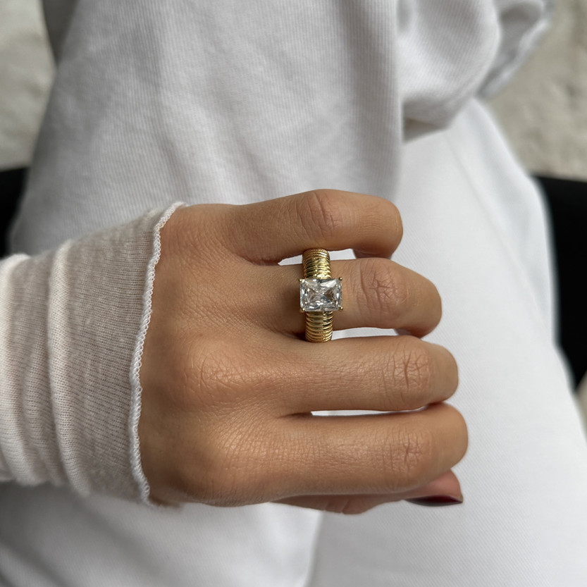 Масивна каблучка з нержавіючої сталі та цирконом (прозорого або зеленого кольору), елегантний та помітний акцент на кожен день.